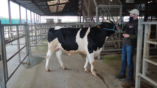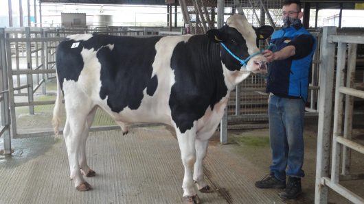 Mountfarna Dallas, joined-third highest bull with John O’Callaghan on the halter