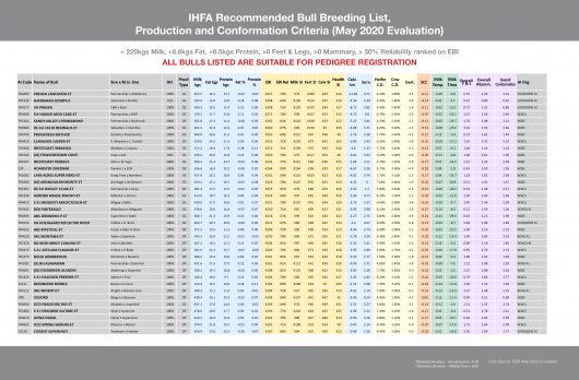 IHFA Recommended Bull Breeding List, Production and Conformation Criteria, May 2020 Evaluation