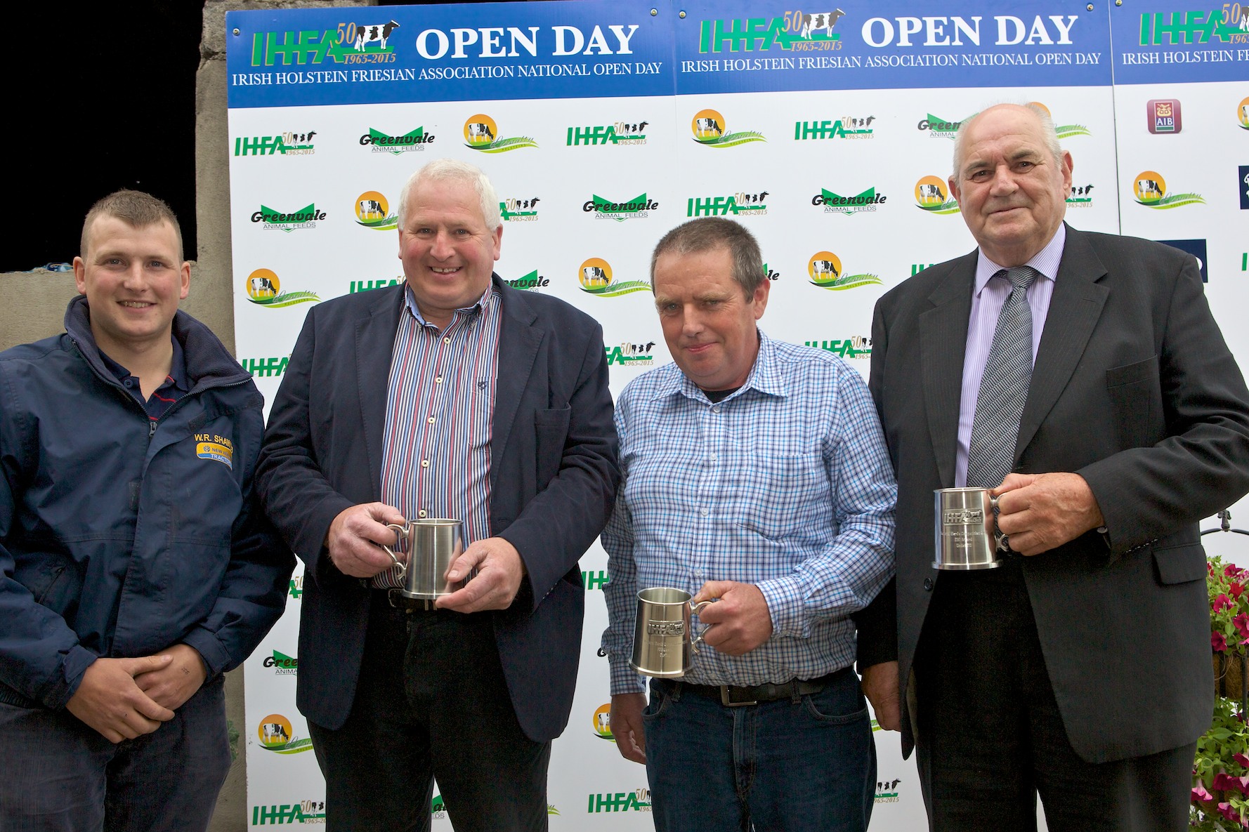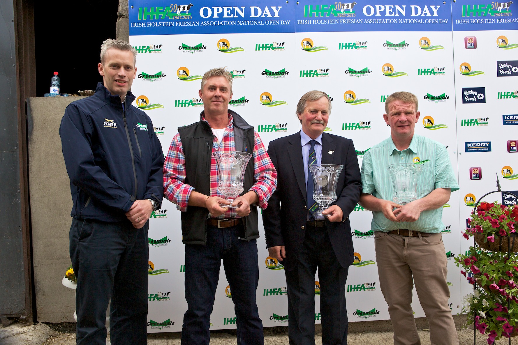 Gordon Richardson, Greenvale Animal Feeds, sponsors of the National Herds Competition with Eamon McLoughney, Nenagh, Co. Tipperary (1st Spring Section), Richard Whelan, Clonard, Co. Meath (1st Under 70 Section), Paul Hannan, Crecora, Co. Limerick (1st Over 70 Section)
