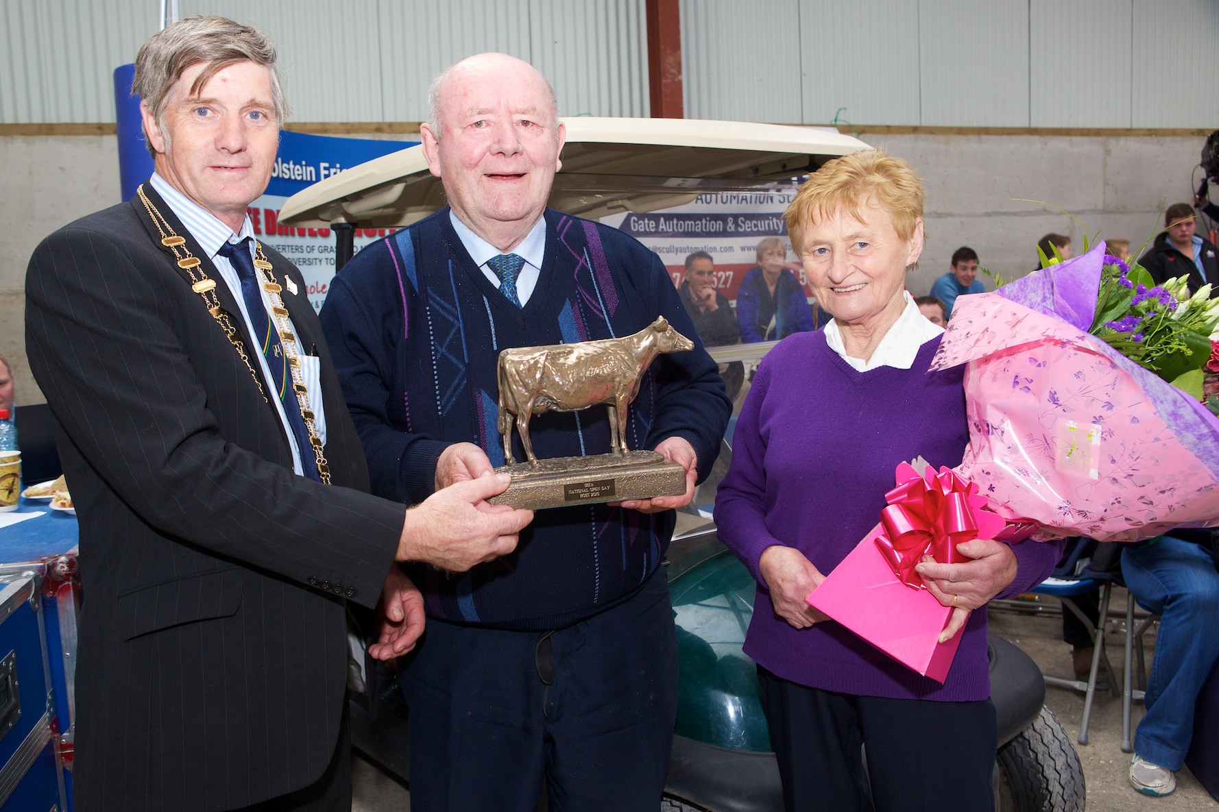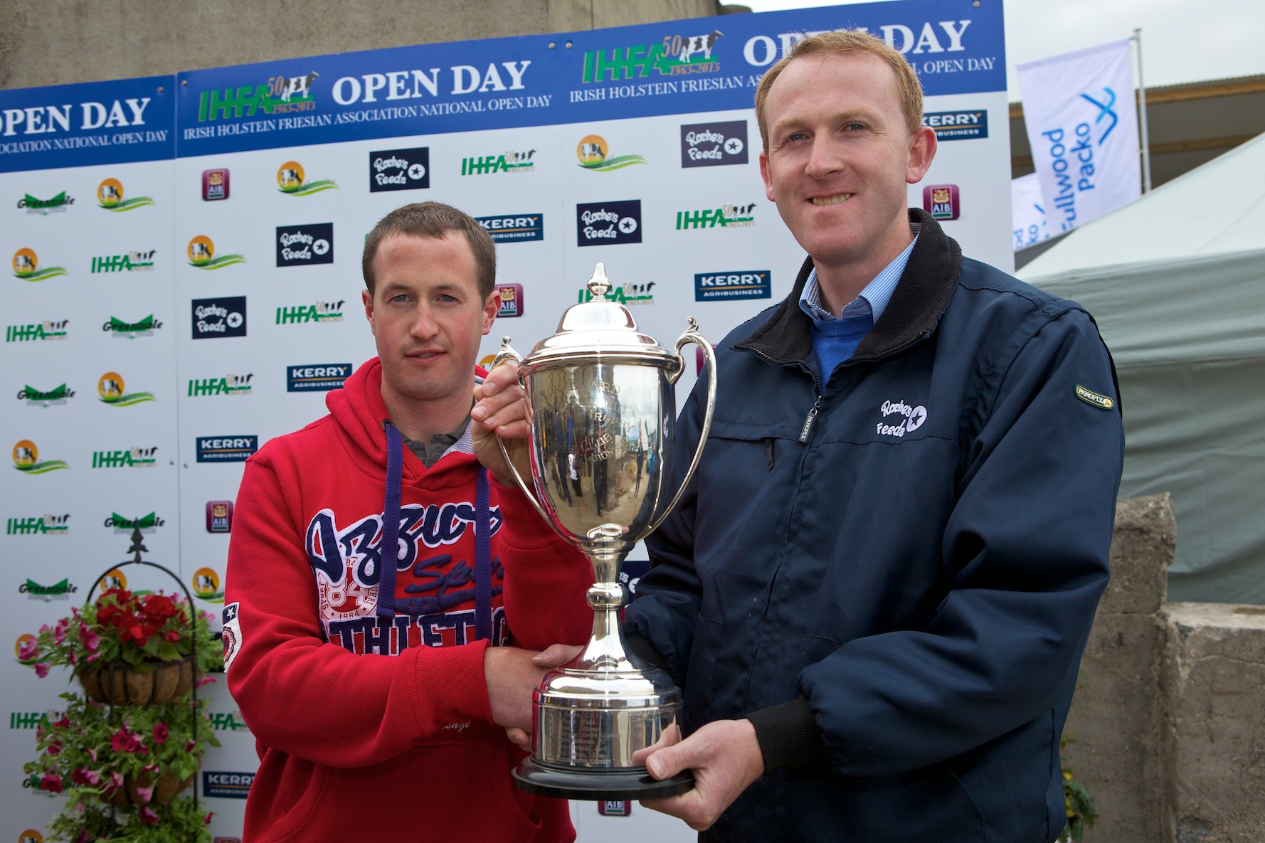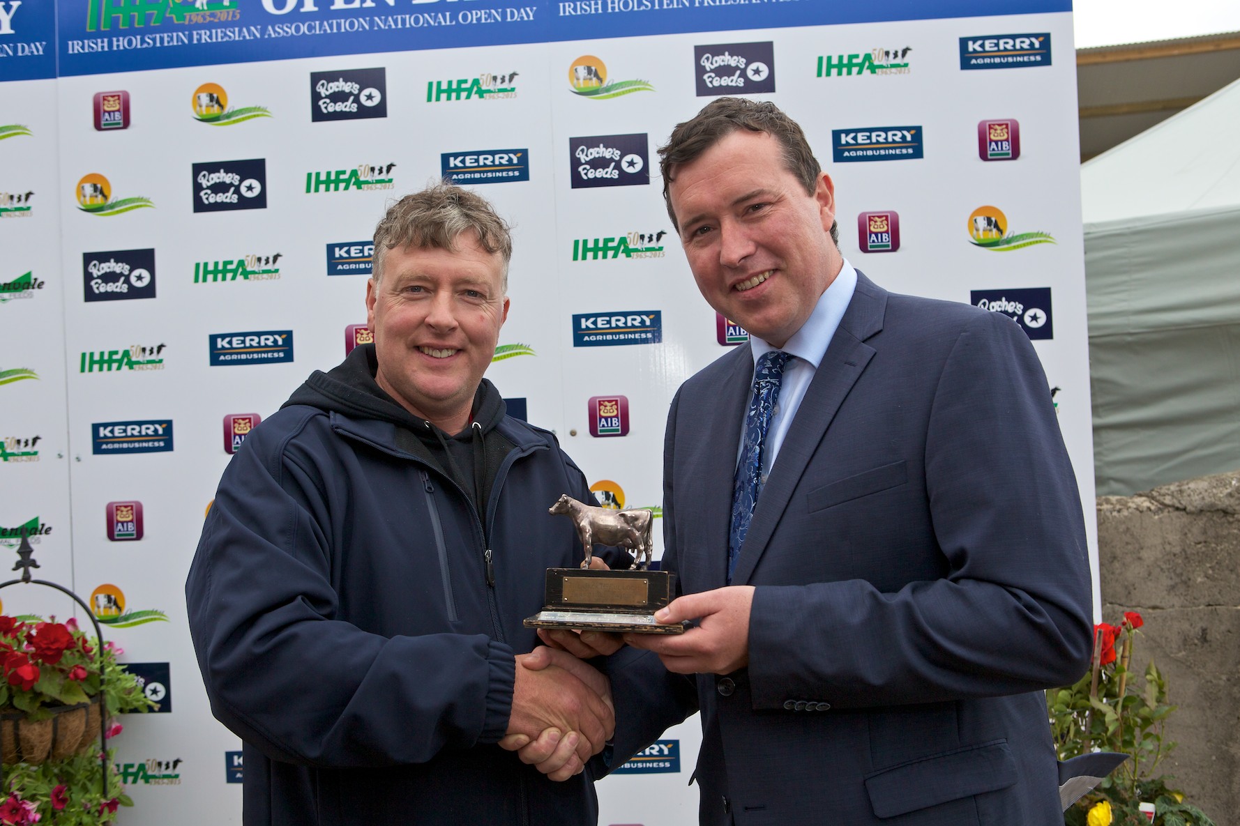 Richard Roche, Roches Feeds (sponsors), with Diarmuid Murphy from the Cork Club, winner of the Milk Board Trophy for the Highest Individual Winner of the 18 – 26 years Section