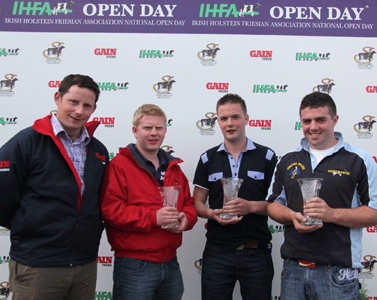 Martin Power of Gain Feeds (sponsor) with Matthew McClean, James Weatherup and Matthew Muldrew of the Northern Irish Under 18 years Stockjudging team.