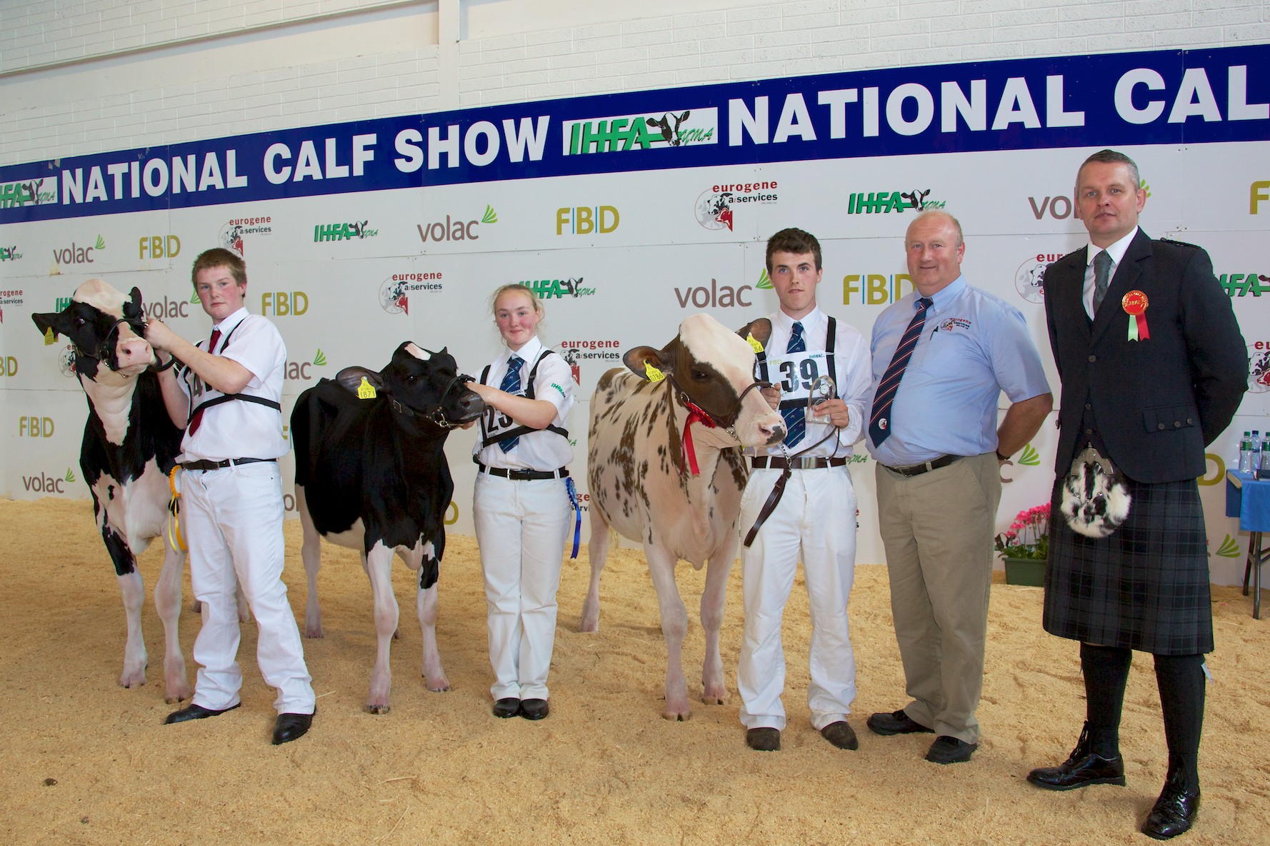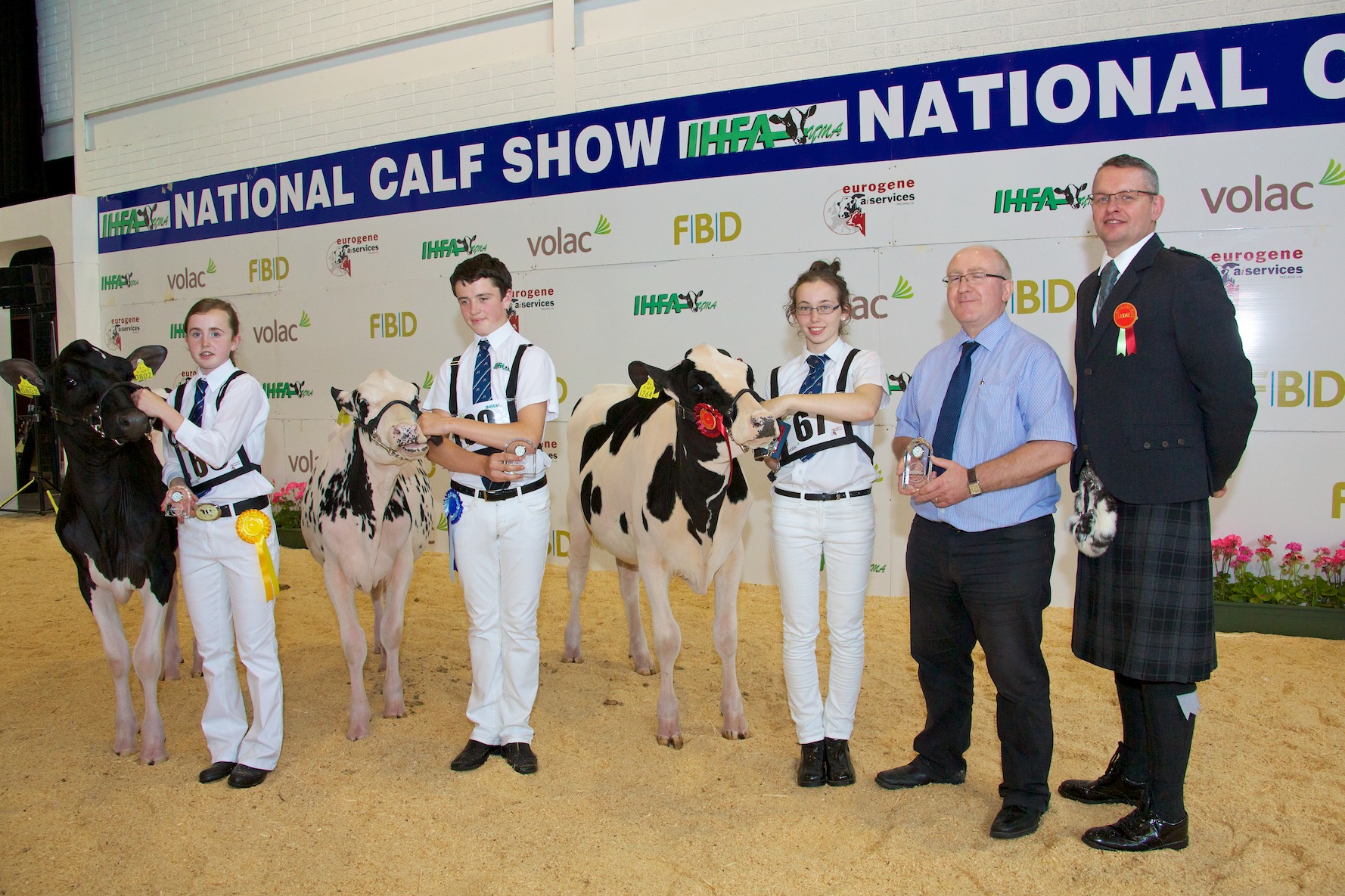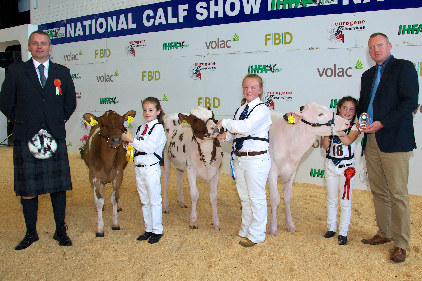 Knoxtown Bradnick Memory owned by Sean Murphy, handler Gearoid Murphy 3rd, Mounteen Stonewall Nula owned by John Kirby, handler Claire Kirby 2nd, Bunacloy V-B Doorman Alioli ET owned by Mike Magan, handler Alice Magan 1st in the Mature Calf class born Jan-Feb 2014 with Liam Gannon, Volac (sponsor) and David Gray Judge and Julie Gray