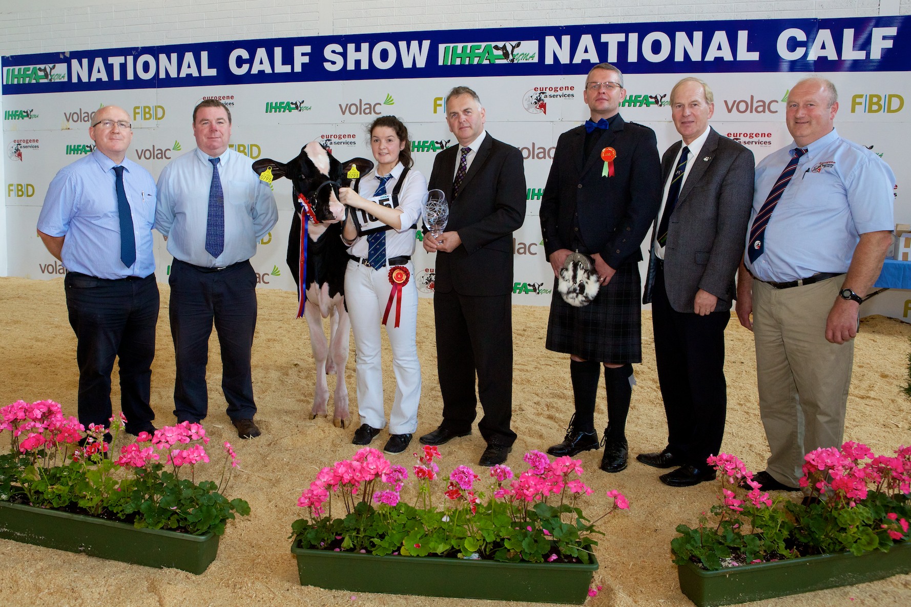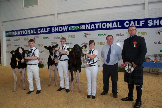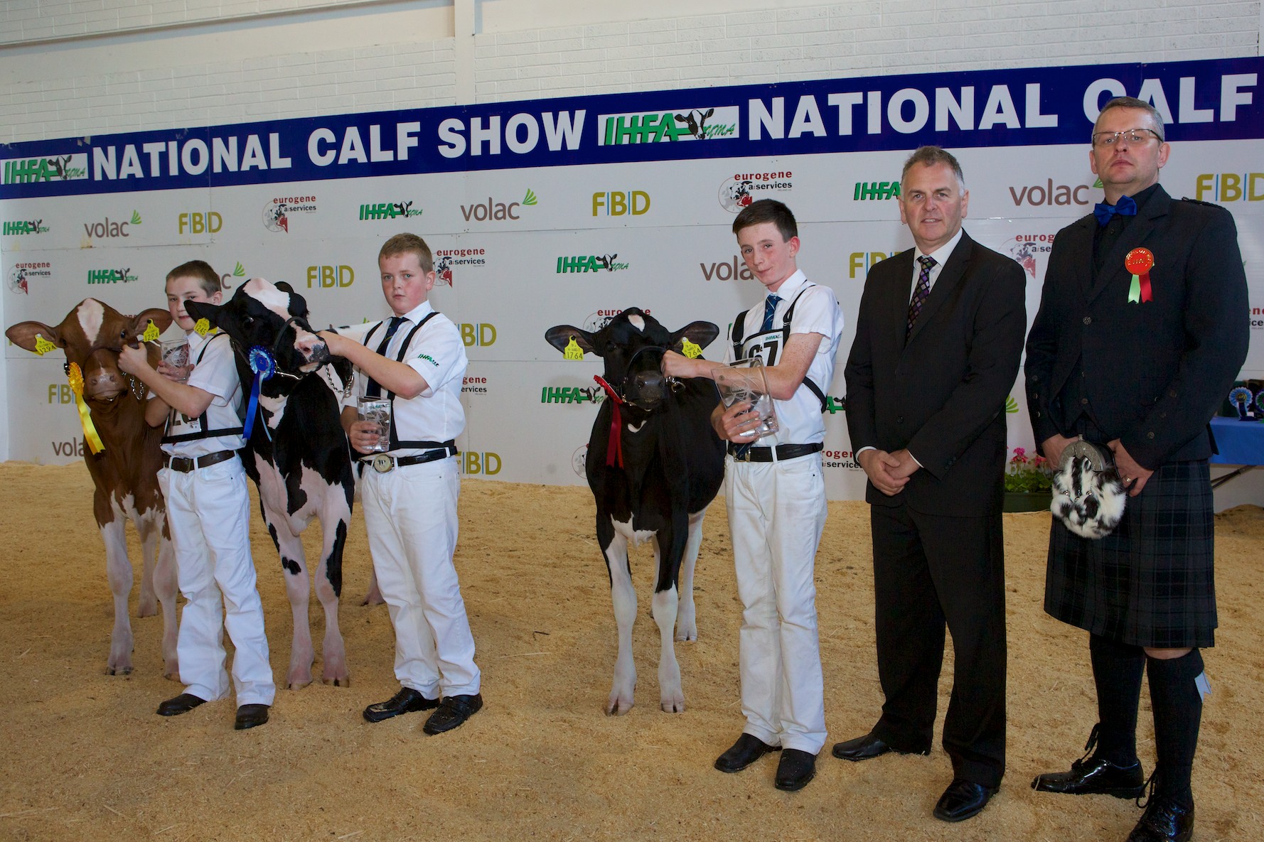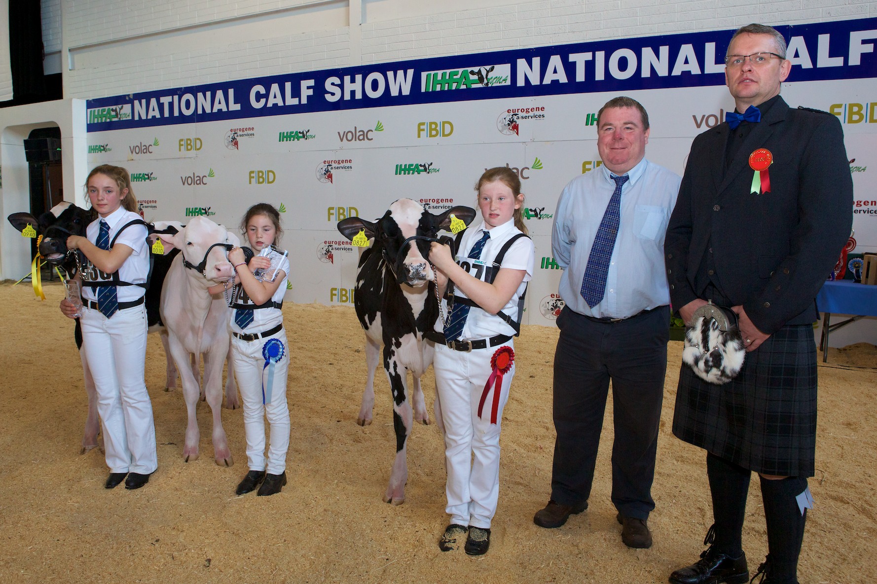 Knoxtown Bradnick Memory owned by Sean Murphy, handler Gearoid Murphy 3rd, Mounteen Stonewall Nula owned by John Kirby, handler Claire Kirby 2nd, Bunacloy V-B Doorman Alioli ET owned by Mike Magan, handler Alice Magan 1st in the Mature Calf class born Jan-Feb 2014 with Liam Gannon, Volac (sponsor) and David Gray Judge and Julie Gray